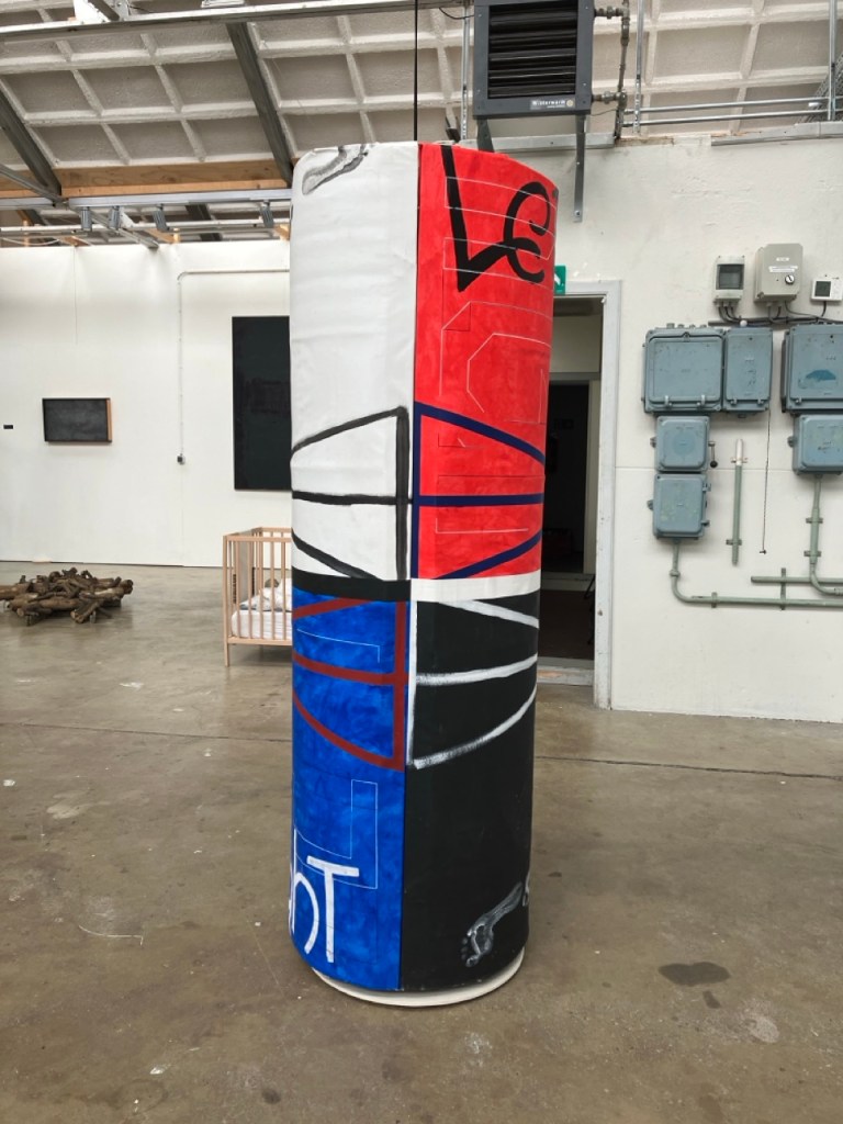 Acrylic, ink, marker, chalk on canvas.