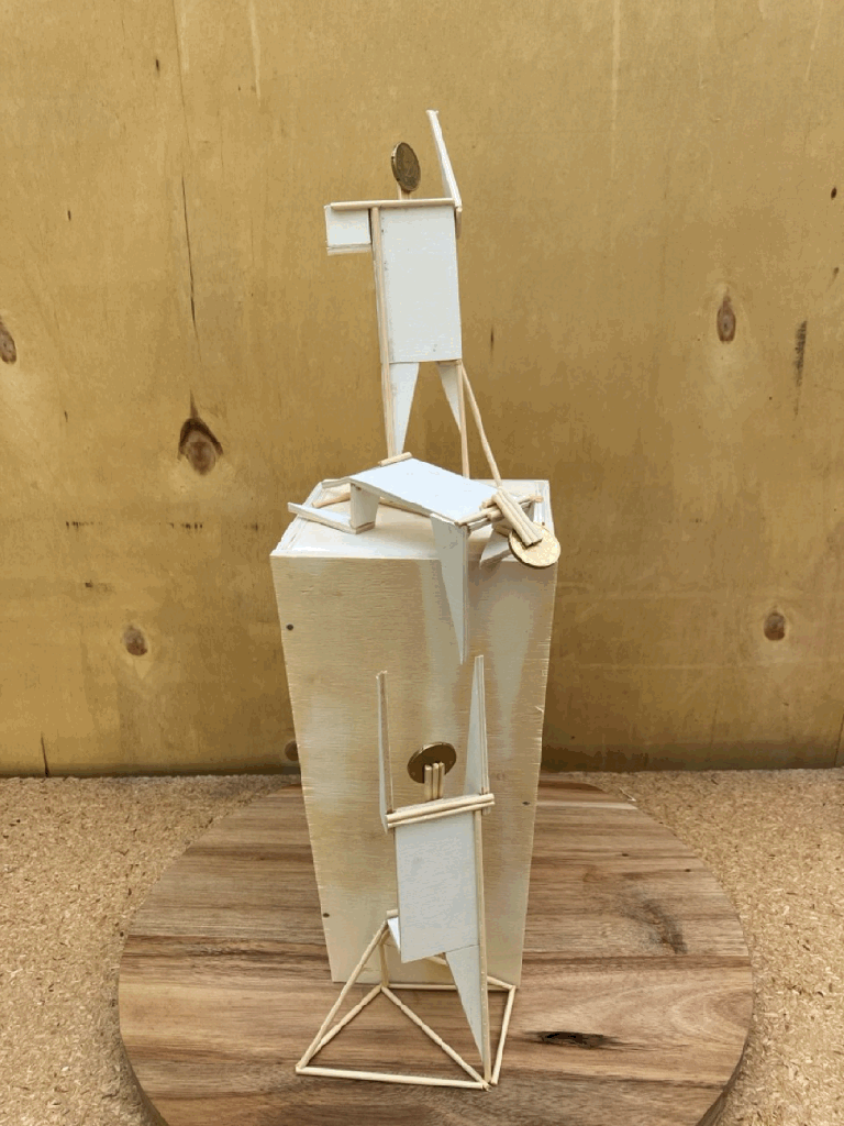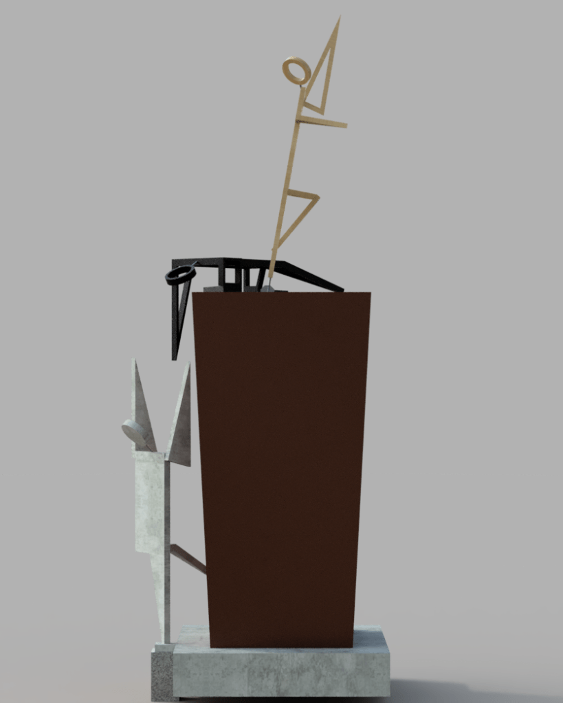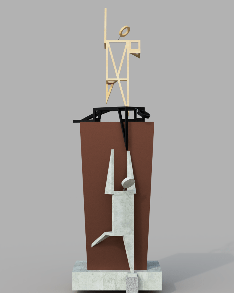 The figure standing on top of the pedestal with a raised leg is called ‘Climbing Man’. As an ode to Dirk Debaecke this figure is made from stained wood. (If possible I will try to make this figure using found wood as an ode to Marc Hendricks’ recycled art practice; which also fits with my own practice).