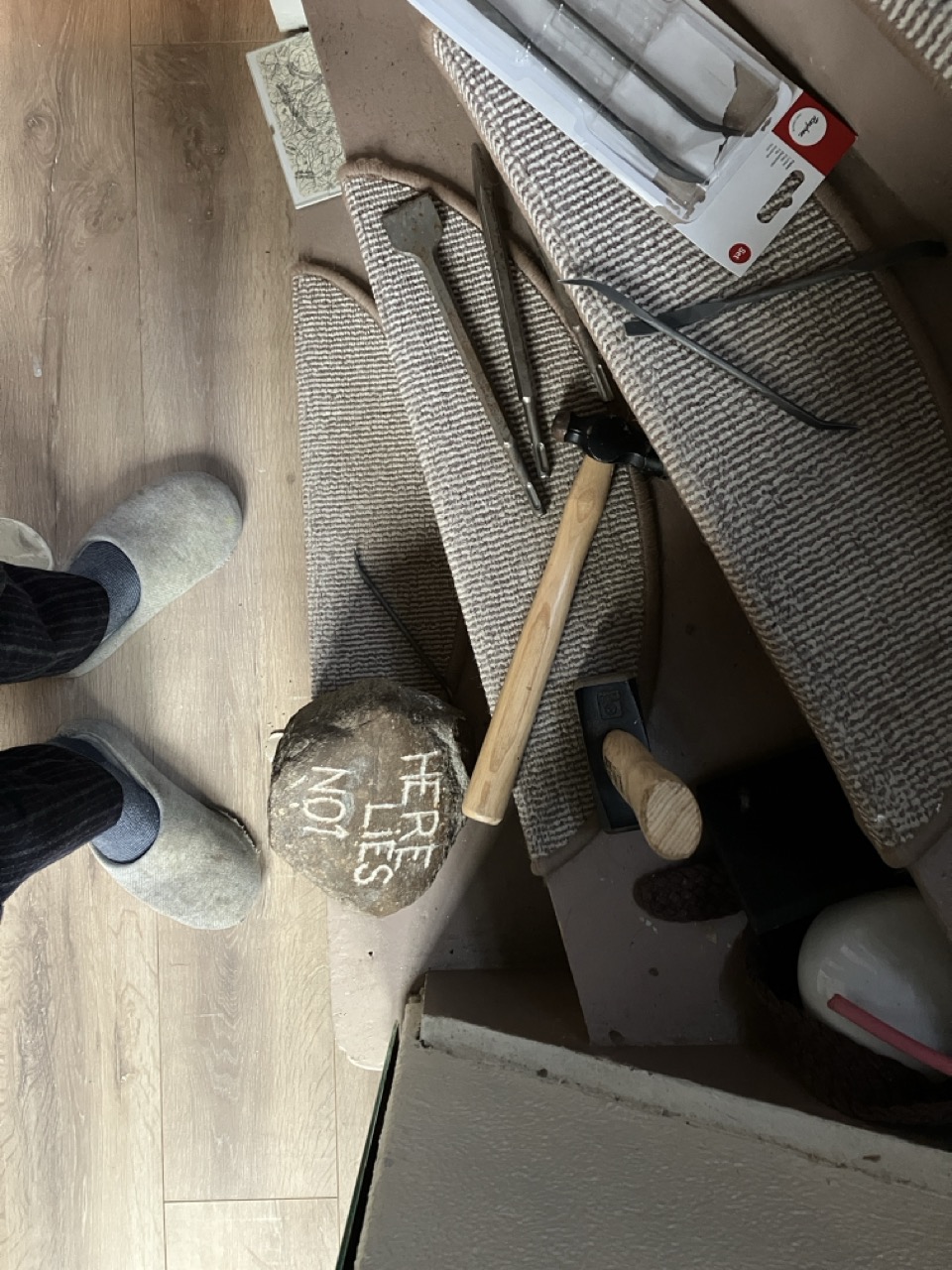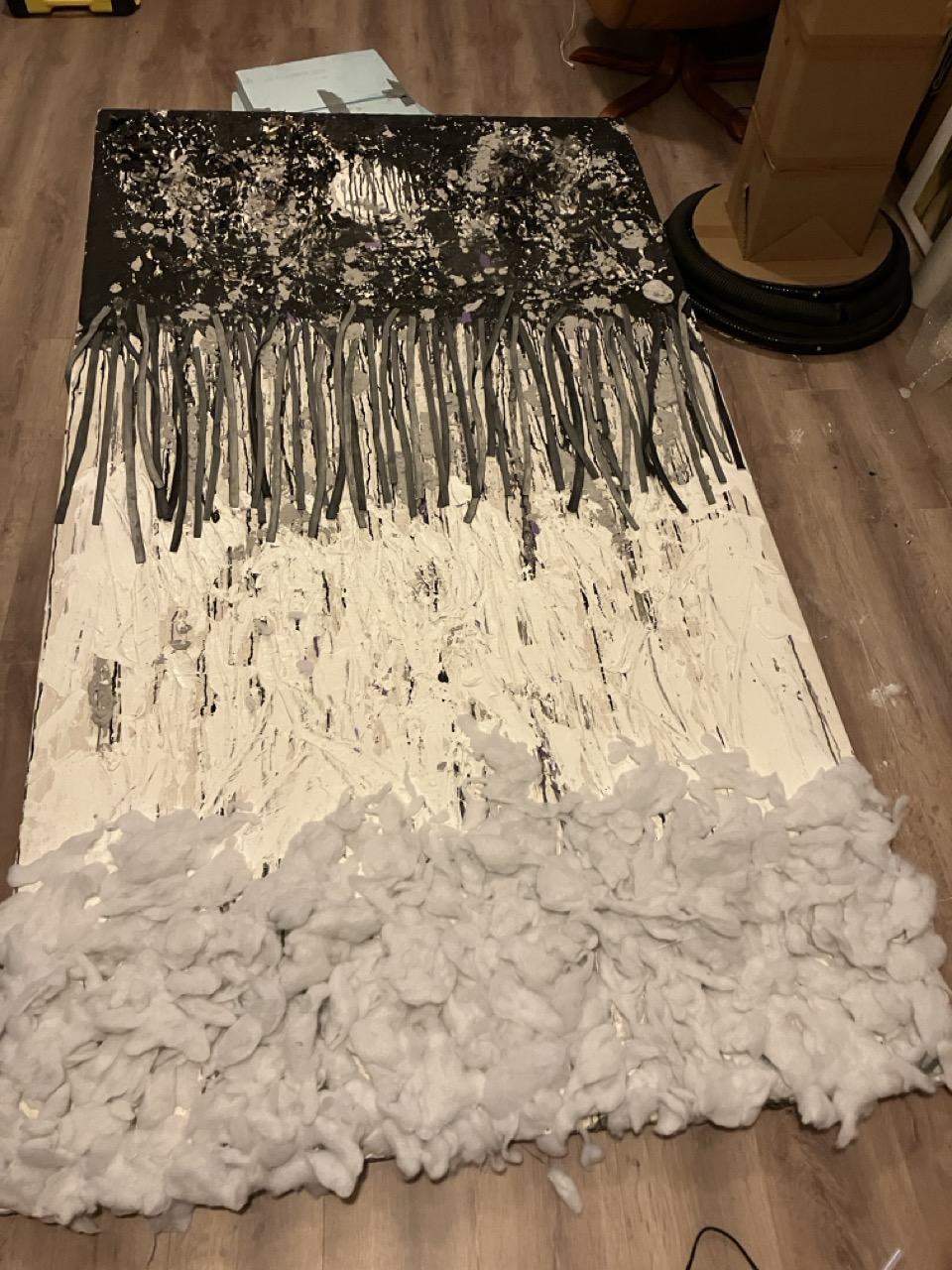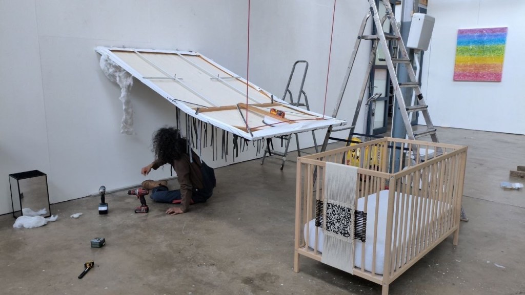 In N01 at home a faint light is shed into My Life. Using a mirror as a reflexive tool, the sculptural painting U R N01 brings one into the work; coercing the one looking up to reflect on the proposition.