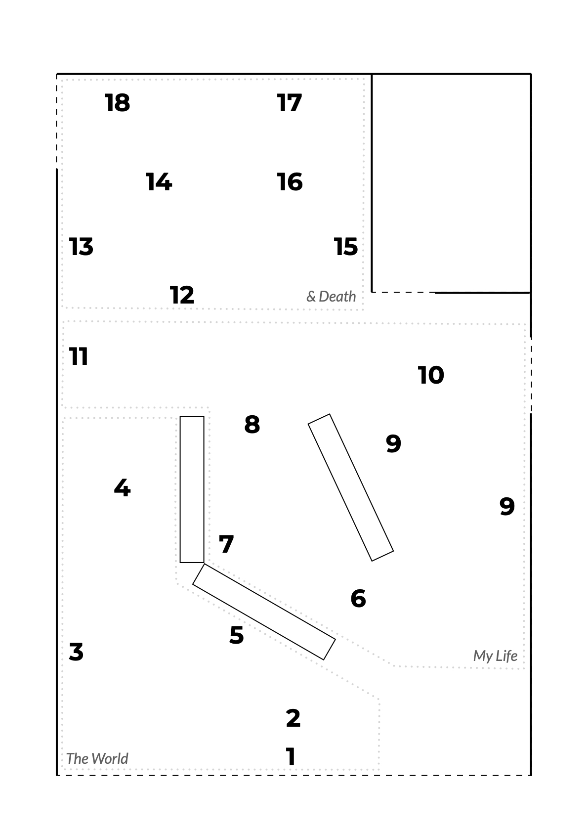 Across three sections of space – The World, My Life, & Death – morality, politics and spirituality are explored using ambiguity and wit to uncover the absurdity of it all.